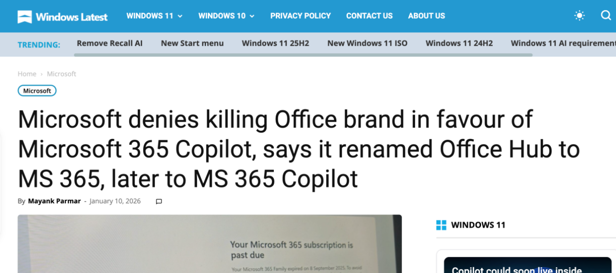 【环球网科技综合报道】1月10日消息,据海外科技媒体Windows Latest透露,微软方面表示,Office品牌并未消失。此前Office应用更名为Microsoft 365 Copilot,而该应用本身又是在更早由Microsoft 365更名而来。