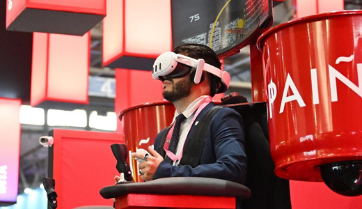 3月2日,在西班牙巴塞罗那,一名参观者体验人体控制系统。新华社记者程敏摄